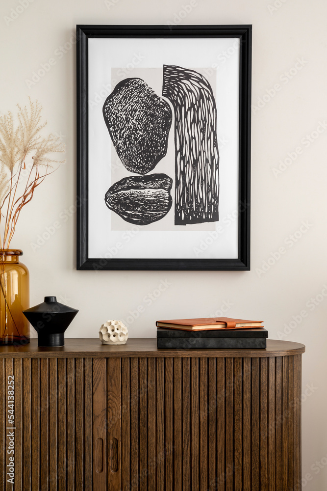 Domestic and cozy interior of living room with mock up poster frame, wooden commode, glass vase with dried flowers, black candle, books and stylish personal accessories. Home decor. Template.