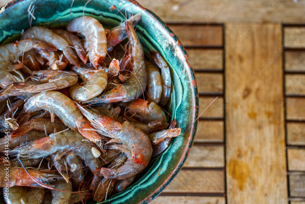 Freshly caught shrimp in a bowl ready to be cooked.