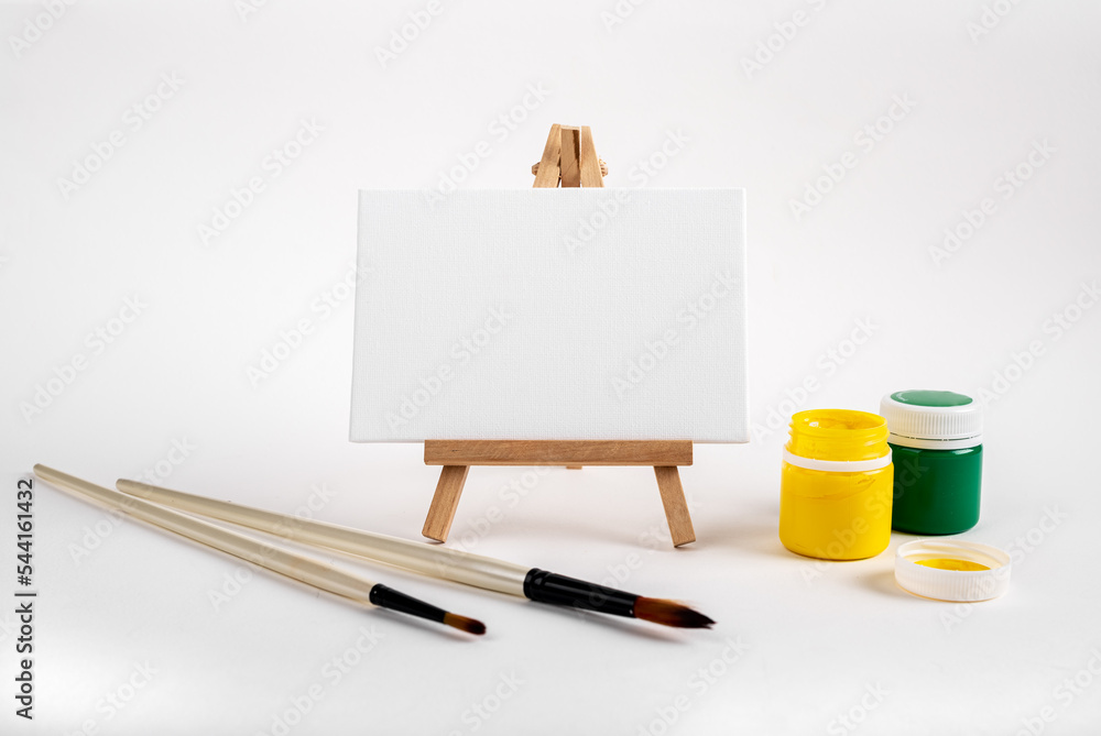 Blank canvas templte, empty paper mockup on wood easel with brushes and gouche paints jars