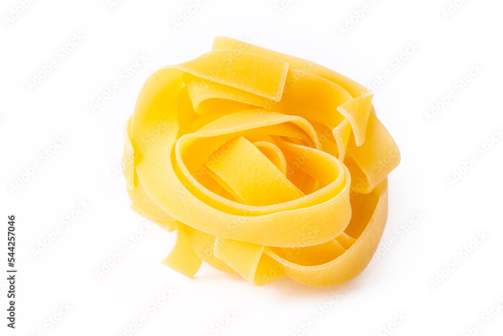 Homemade egg pasta tagliatelle. Raw nest noodles, uncooked ribbon fettuccine, dry long rolled macaroni isolated on white background top view