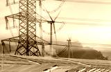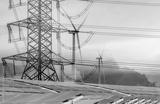Sustainable energy. Solar farm, wind turbine, and electric pylon with sunset sky. Sustainable resources. Solar, wind power. Renewable energy. Green energy. Carbon neutrality and net zero emissions.