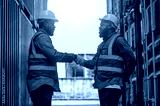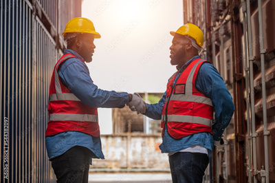 Team African American worker concept, African American worker teamwork working in warehouse containers for logistic import export, team Black man worker shake hand
