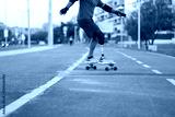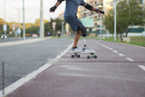 Caucasian man with disability riding skateboard in park. Close-up of person with prosthetic leg on skateboard. Sport, disability, hobby concept