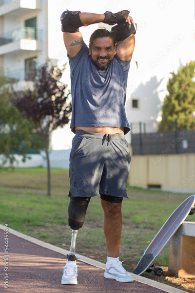 Sportsman with prosthetic leg getting ready for training. Man in sport clothes stretching in park on summer day, smiling. Sport, training concept