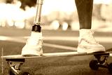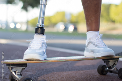 Sportsman in white sneakers standing on skateboard. White shoes and longboard, man training in park. Sport, disability concept