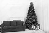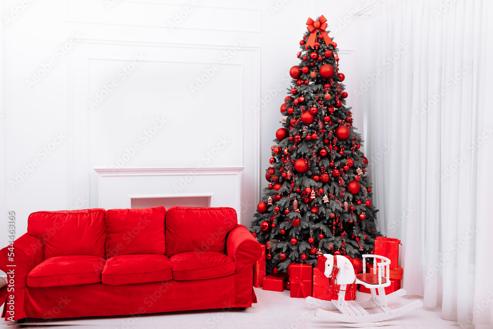 Stylish Christmas minimalist interior with an elegant red sofa. Comfort home with fireplace. Gifts boxes under Christmas tree with decorations red balls in white living room