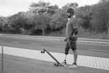 Side view of determined person with disability on skateboard. Caucasian man with mechanical leg in helmet skateboarding in park on sunny day. Sport, disability concept