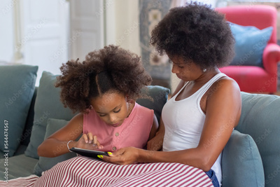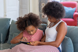 Happy young mother reading to daughter. African American woman sitting on coach with little girl, looking at electronic book or tablet. Family, leisure, technology concept