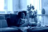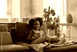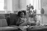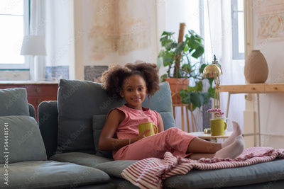 Portrait of African American girl in pink overall. Cute child with curly hair drinking hot cocoa milk or tea from yellow mug. Portrait, childhood concept