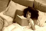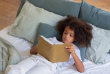 Interested African American girl reading story in bed. Child with curly hair lying in bed, looking at book with concentration. Portrait, childhood, relaxation concept