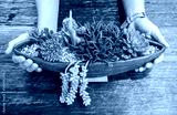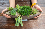 Woman holding a tray garden with various succulent and cactus planting inside.
