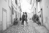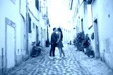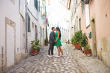 Side view of young loving man and woman kissing in city street. Handsome man and beautiful woman in dress standing in narrow street holding hands and kissing. Romance, relations and travelling concept