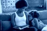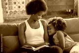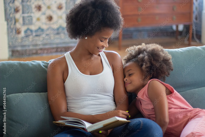 Attentive young mother reading book to daughter. African American woman sitting on coach, tender girl leaning on shoulder. Family, leisure, love concept