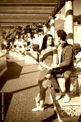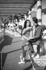 Portrait of happy multiethnic couple spending time in city. Fair-haired man and beautiful woman resting on summer alley enjoying good weather and talking. Romance, relations and travelling concept