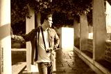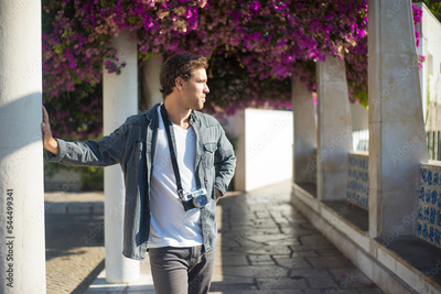 Portrait of young Caucasian man travelling with camera. Happy man spending vacation in old city enjoying rest and taking photos of interesting places. Travelling, active rest and vacation concept