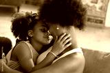 Fond African American mother and daughter hugging. Woman and girl in casual clothes holding each other on coach, rubbing noses. Love, family, bonding concept