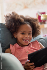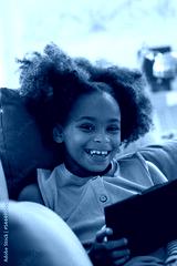 Portrait of merry little girl reading electronic book. African American girl with curly hair, holding electronic book or tablet. Smiling. Education, leisure, technology concept