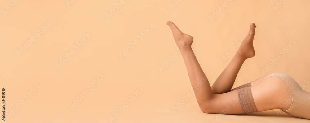 Legs of beautiful young woman in stockings on beige background with space for text