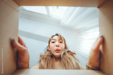 Surprise excited asian woman opening gift Christmas and new year box, Inside view of carton box bottom, Satisfied client, positive feedback. Delivery and online shopping concept.