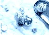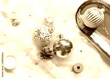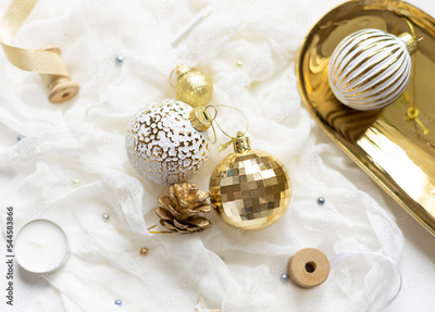 Christmas celebration concept composition with golden and white decoration on the table. Close up
