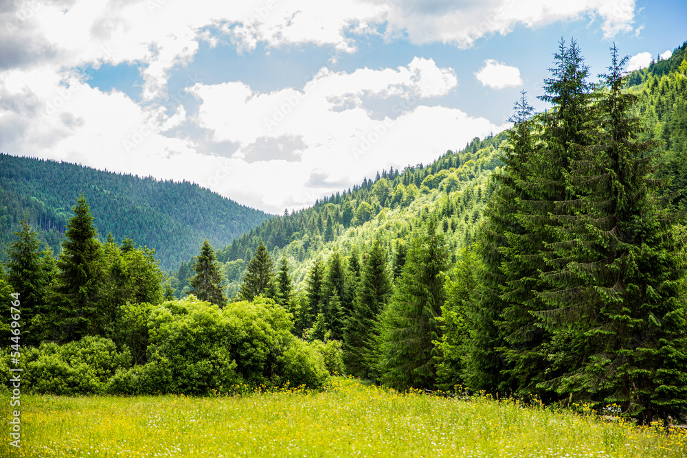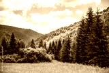 Magical fairytale forests. Coniferous forest covered green moss. Oniferous forest. Sunset Sunrise Sun Sunshine In Sunny Summer Coniferous Forest. Sunlight Sunbeams Through Woods In Forest Landscape
