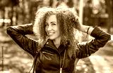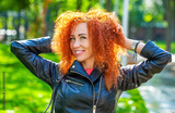 Portrait of beautiful cheerful redhead girl flying curly hair smiling laughing. Smiling happy woman curly red hair. Closeup portrait woman, girl red hair