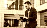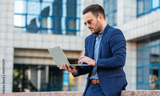 Business people. Businessman checking data via laptop in front of the office. Business, lifestyle concept