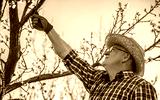 Orcharding. Gardener pruning tree with a shears in the orchard. Hobbies and leisure, agricultural concept