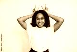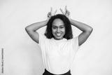 Portrait of happy young woman making bunny ears over white background. African American lady wearing white T-shirt looking at camera and smiling. Fun concept