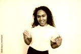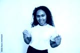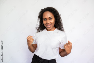 Portrait of happy young woman clenching fists over white background. African American woman wearing white T-shirt making winning gesture and smiling. Success and happiness concept