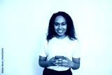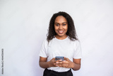 Portrait of happy young woman holding mobile phone over white background. African American woman wearing white T-shirt looking at camera and smiling. Mobile technology concept