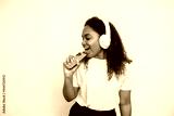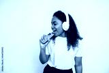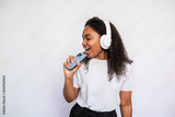 Portrait of happy young singing in phone as in microphone. African American woman wearing white T-shirt holding smartphone and listening to music in headphones. Leisure and music concept