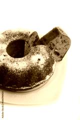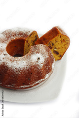 Homemade sliced pumpkin bundt cake with raisins and walnuts isolated on white background