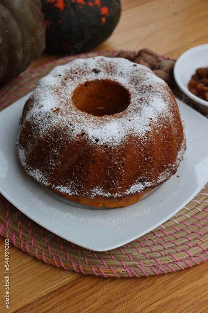 Homemade pumpkin bundt cake with raisins and walnuts on a plate on wooden table