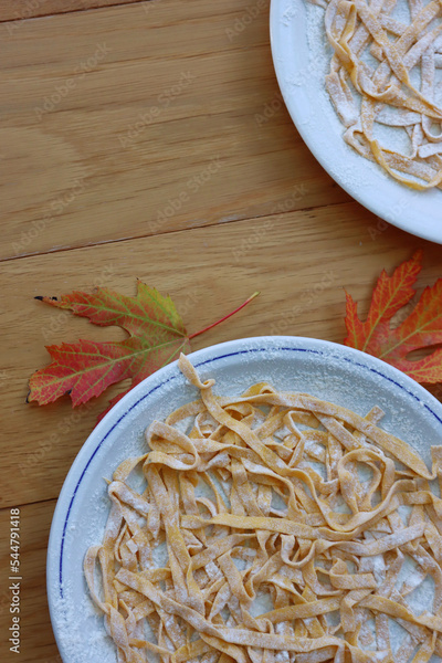 Homemade italian traditional pumpkin Tagliatelle pasta on a plate with flour on wooden table. Raw itialian pasta also called fettuccine, tagliatelle or pappardelle