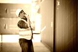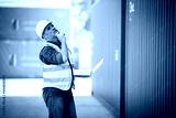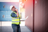 Portrait Engineer worker under working inspection and checking with radio communication ,file document container dock yard shipping dock yard logistics export import business concept.