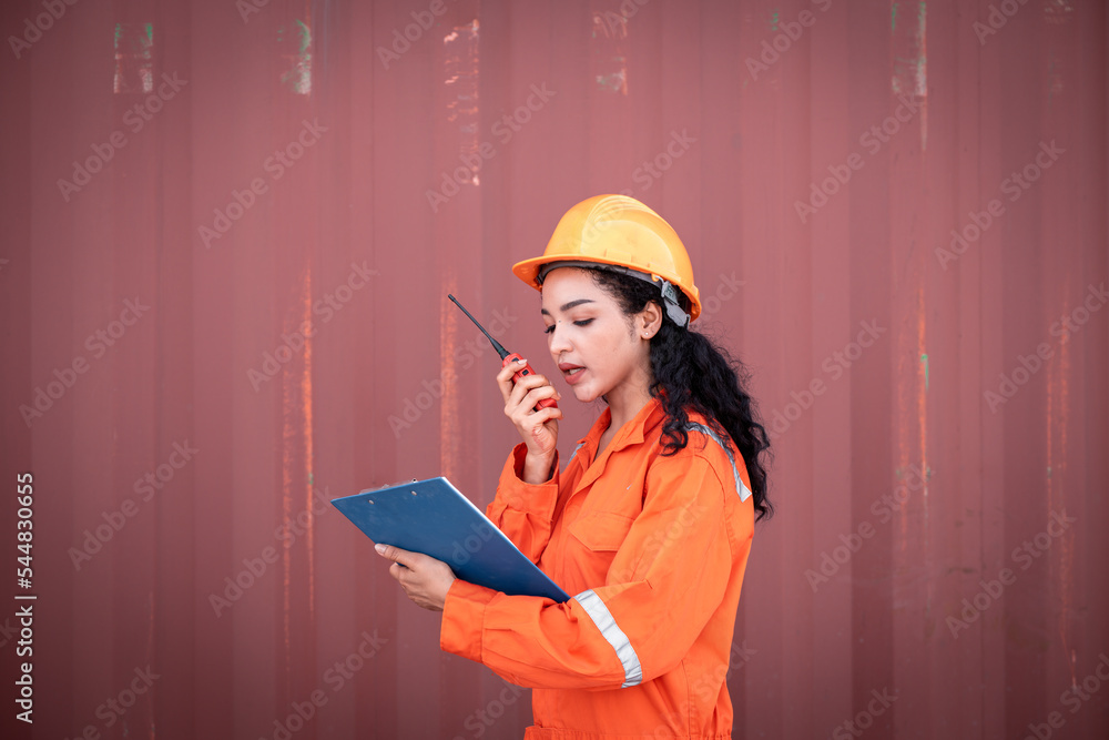 Portrait Engineer worker under working inspection and checking with radio communication ,file document container dock yard shipping dock yard logistics export import business concept.