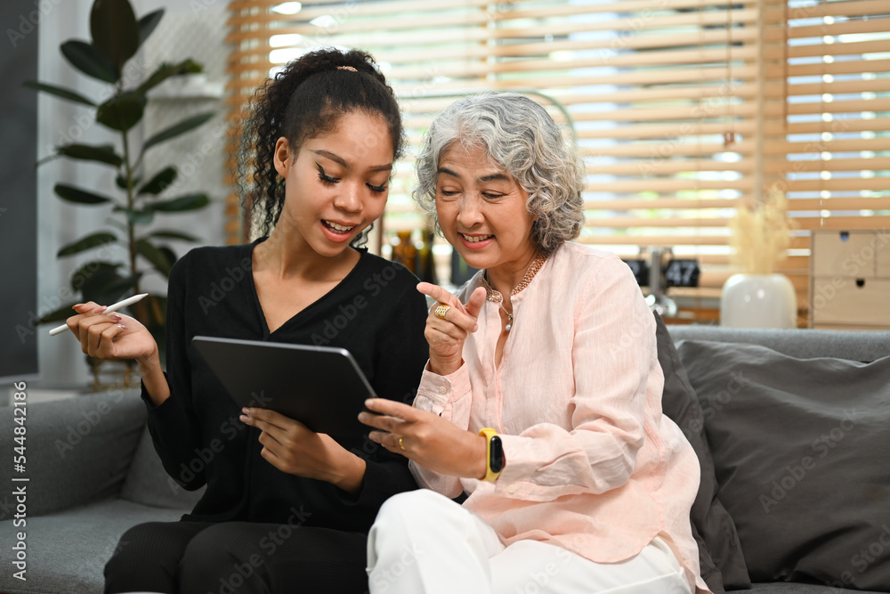 Smiling young woman teaching interested elderly mother how to use a tablet or shows some application. Elderly, technology concept