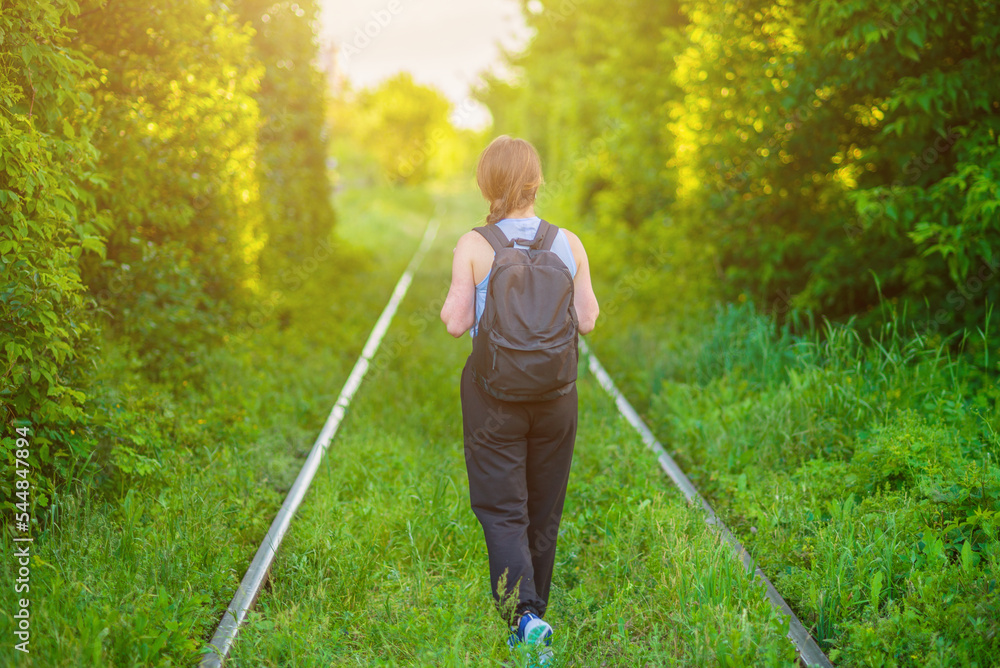 A girl with a backpack walks along the railway tracks with a backpack on her back