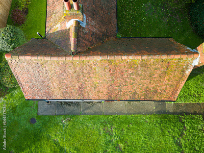Drone view of an old farmhouse roof showing gaps in the old roof tiles. Seen prior to a new roof being added.