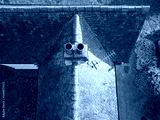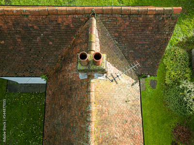 Drone view of an old farmhouse roof showing gaps in the old roof tiles. Seen prior to a new roof being added.
