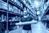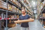 Caucasian young male smiling in glasses warehouse worker holds a box against the background of the aisle of warehouse racks for storage. Assembly and preparation for shipment of goods.
