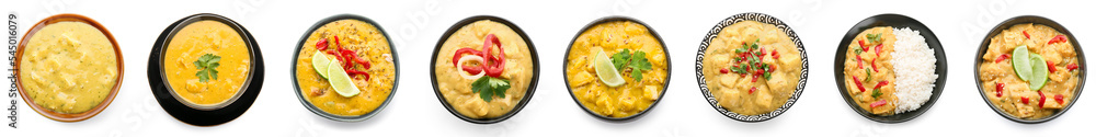 Set of tasty chicken curry on white background, top view