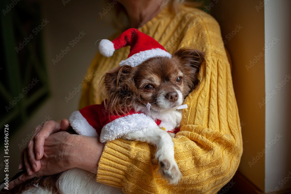 An elderly woman holds cute little dog in red hat in her arms and looks out the window waiting either for relatives or for miracle from Santa, grandparents care, social distance celebration at home