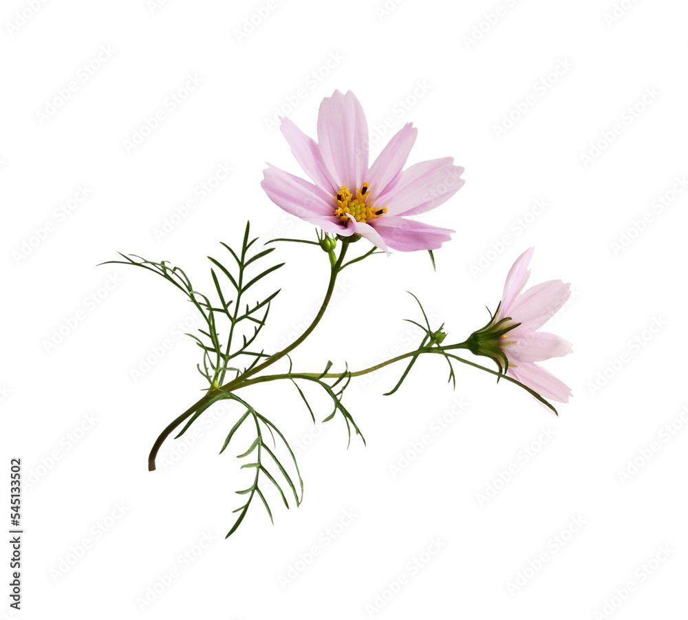 Pink cosmos flowers, bud and leaves isolated on white or transparent background