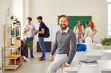 Portrait of a cheerful male teacher at work. Happy adult man smiling and looking at the camera while standing by a desk in the school classroom with students in the background