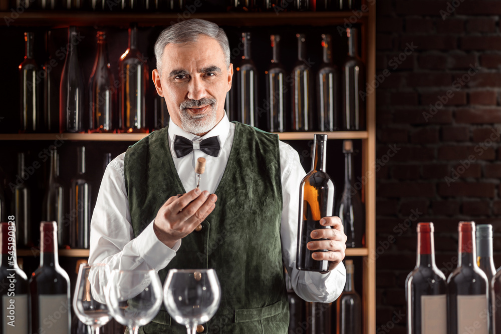 Sommelier with a bottle of wine. Examination of wine products. Restaurant staff, expert wine steward among shelves of wine bottles. Stylish middle-aged man with a grey beard