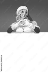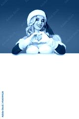 Christmas Santa Helper Elf female character showing heart with hands. Women wearing Fancy red Dress and hat. Ladies Xmas Party Outfit
