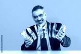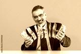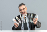 Successful business, income a lot of money concept. Businessman adult man wearing a formal suit with a tie, and beard, sitting at the table in the office near the gray wall