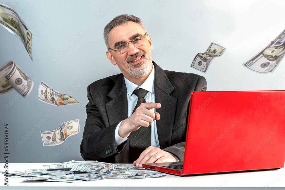 Million-dollar rain concept. Businessman with laptop sitting at the table in the office near the gray wall. Adult man wearing formal suit with a tie